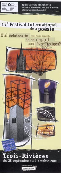 ![]() Series Reviews (Event reviews appear in separate section.) The 17th International Festival of Poetry, Trois Rivières, Quebec (9/28-10/7) by Bertha Rogers Makor's "Poetry & Mentorship" Series: The 10/25 Session with Theodore Weiss, Frederick Feirstein, Wade Newman ~ . ~ . ~ The 17th International Festival of Poetry Trois Rivières, Quebec (9/28-10/7) by Bertha Rogers Imagine a city with permanent poetry plaques on every other building; imagine a city where the mayor hosts a reception for visiting poets; imagine elegant restaurants and jazzy bars interrupting the serving of food and alcohol to listen to poets. Think of a city with a monument to The Unknown Poet, where every St. Valentine's Day, the mayor places bunches of flowers to honor that poet. Imagine a city with its own postal cancellation, "The Poetry Capital of Canada." Trois Rivières, Quebec is such a place, and the man responsible for the burgeoning of poetry there is Gaston Bellemare, a publisher of poetry (Editions Ecrits des Forges), a man so dedicated to the art that his whole life has become a poem of sorts, as has, by extension, the life of his city.
